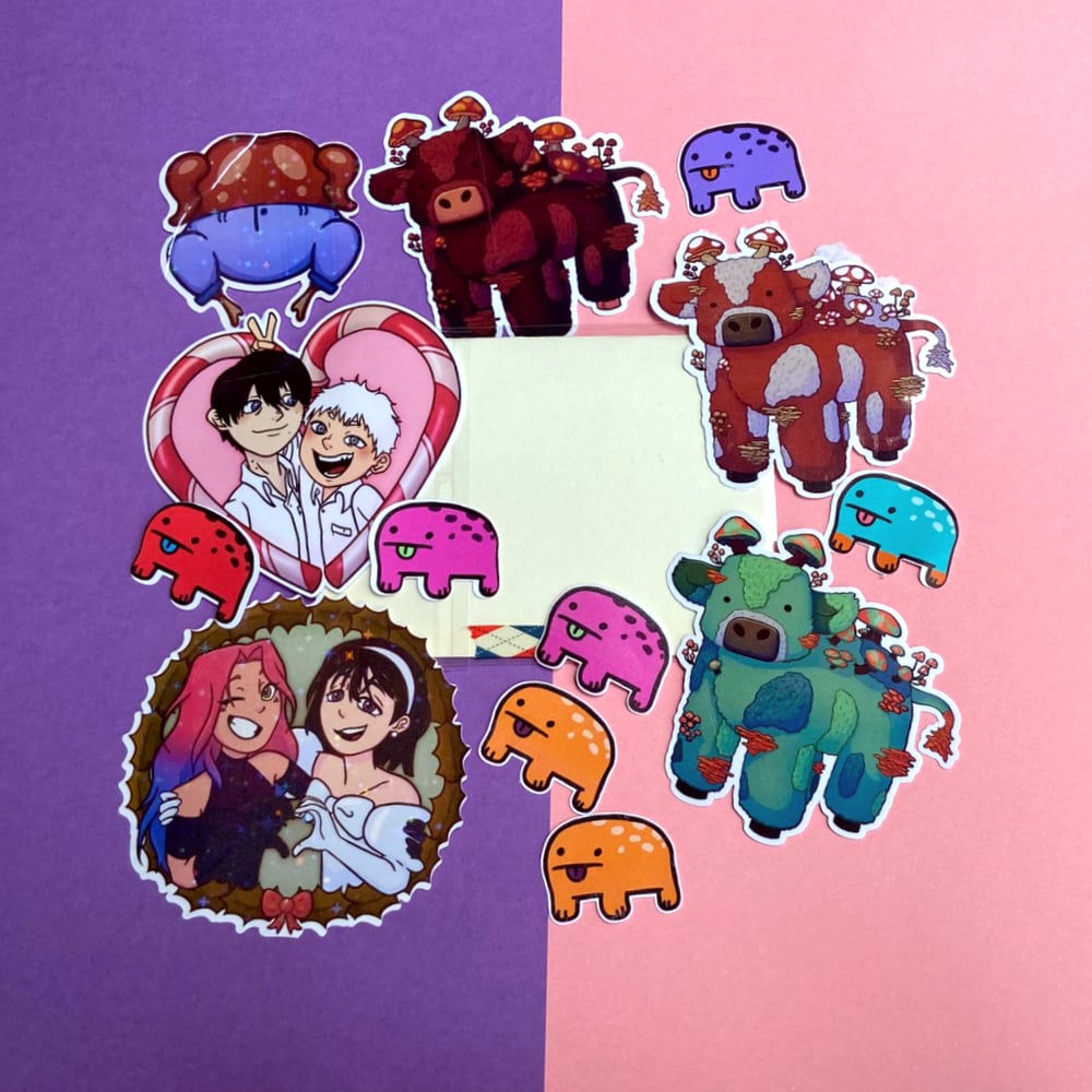 I got a sticker printer and am still learning the best way to make my own stickers, so these packs contain at least 15 goofed up handmade stickers.